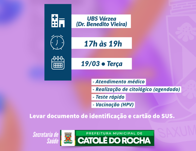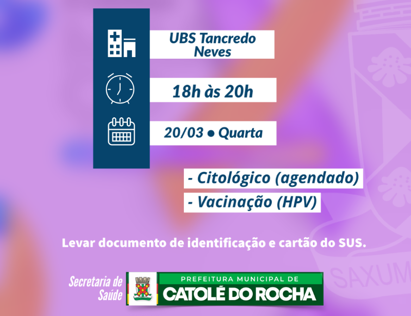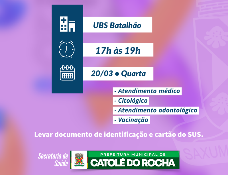 - Quarta-feira, dia 20 (17h às 19h): UBS Batalhão @ubseliomar e UBS Tancredo Neves de 18h às 20h.