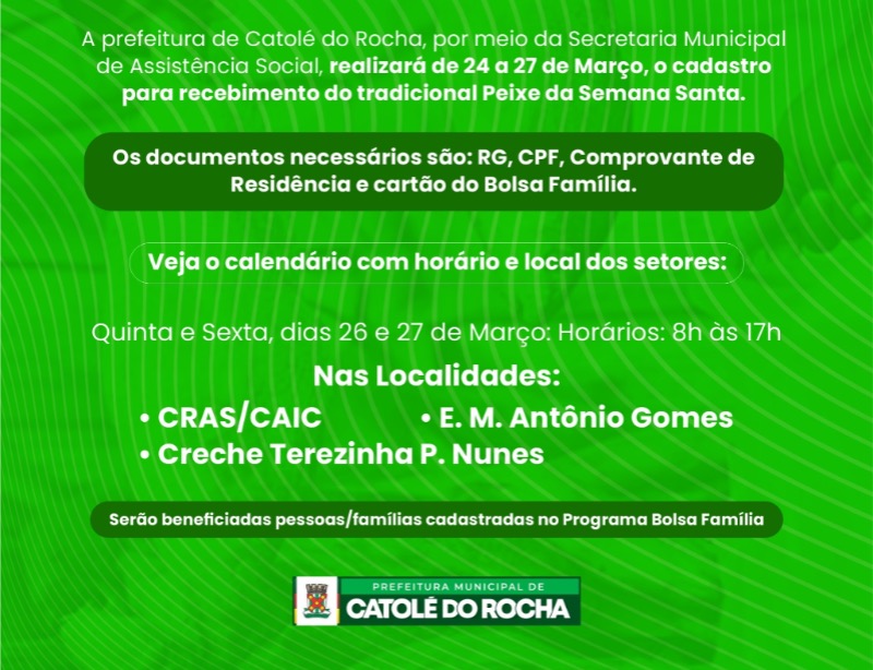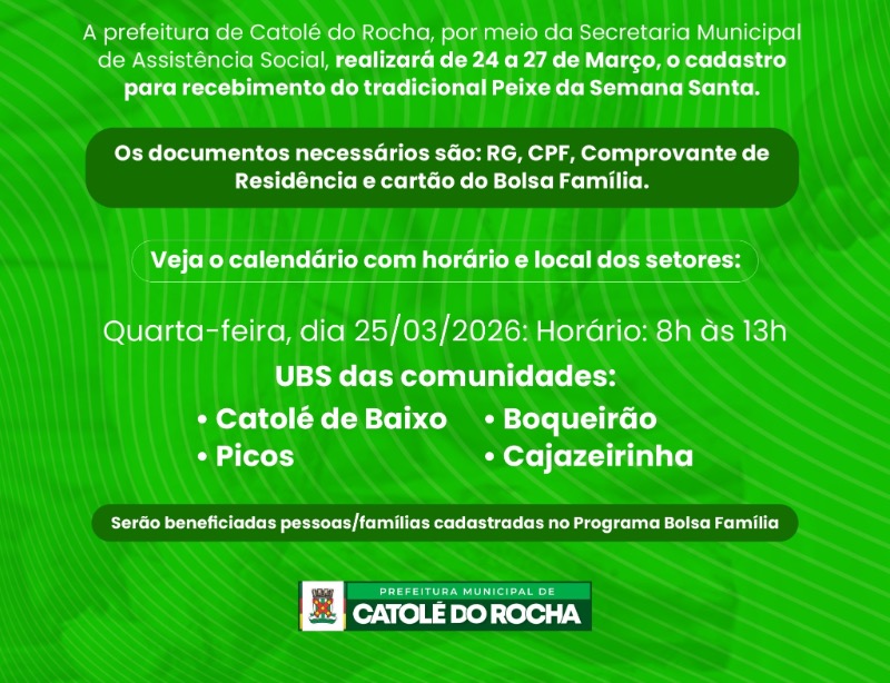 🐠 A Prefeitura de Catolé do Rocha, por meio da Secretaria Municipal de Assistência Social - SEMAS, realizará entre os dias 24 e 27 de março o cadastro para o recebimento do tradicional peixe da Semana Santa.