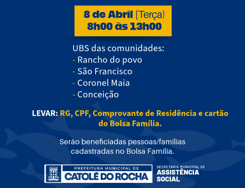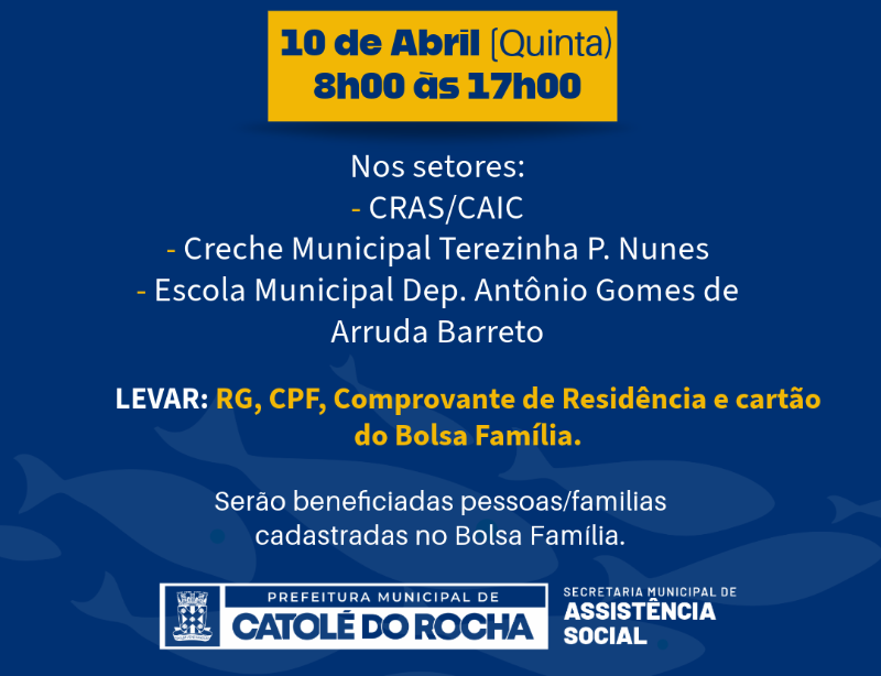 A PMCR, através da SEMAS, realizará na próxima semana o Cadastro para o recebimento do tradicional Peixe da Semana Santa. 🐠 Nos posts, tem o dia e o horário dos setores, além dos documentos necessários para o cadastro. Fique atento!