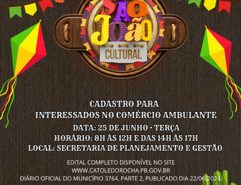 ❗Importante acessar o Edital completo referente ao São João Cultural 2024, disponível no Diário Oficial do Município 3764, Parte 2, do dia 22/06/2024, no site www.catoledorocha.pb.gov.br