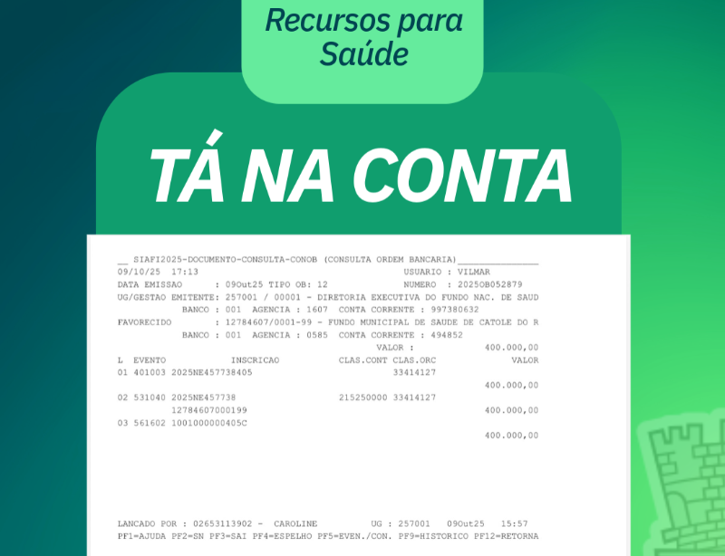 A Prefeitura Municipal de Catolé do Rocha recebeu o valor de R$ 400 mil (quatrocentos mil) destinados ao Fundo Municipal de Saúde.