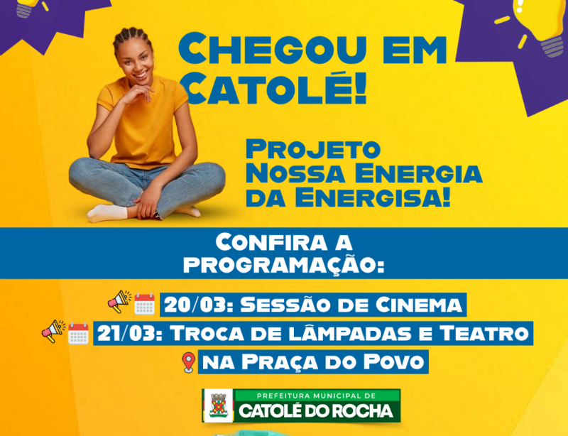 💡 Catolé do Rocha recebe o Projeto Nossa Energia da Energisa nos dias 20 e 21/03 de março. O evento acontecerá na Praça do Povo (Praça de Eventos Cantidiano de Andrade), confira a programação:- Dia 20 (quarta-feira): Sessão de Cinema, a partir das 18h00;