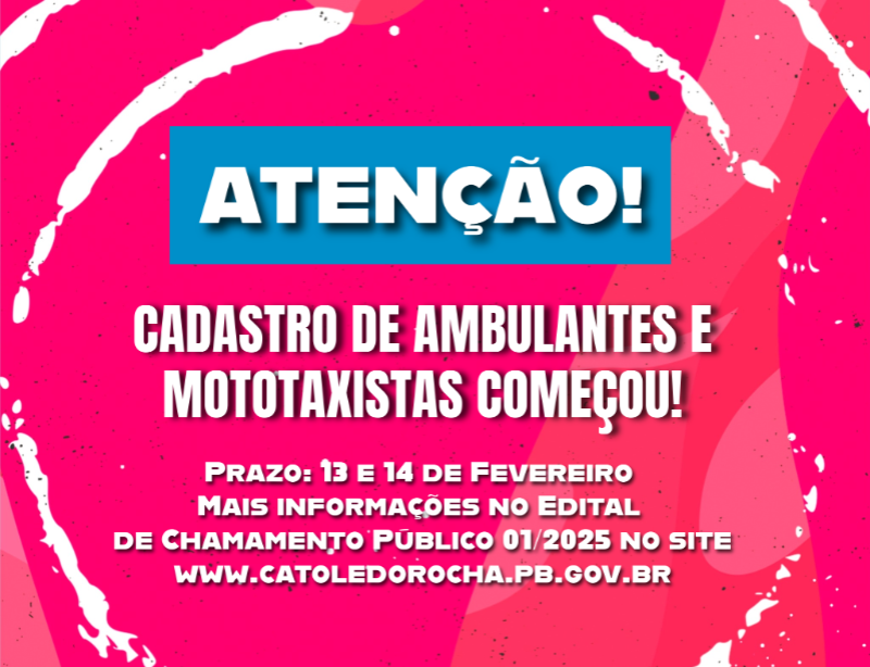 Começou nesta quinta (13) até sexta (14) o cadastro de Ambulantes e Mototaxistas que irão comercializar produtos/serviços na Praça do Povo durante o Carnaval de Catolé 2025.