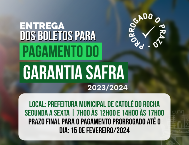 A Secretaria Municipal de Agricultura e a Coordenação Geral do Programa Garantia Safra, informam que o prazo para recolhimento da tarifa de adesão à safra 2023/2024, pelos agricultores/safristas, foi prorrogado até o dia 15 de FEVEREIRO de 2024.A equipe da secretaria segue na entrega dos boletos na sede da PMCR nos horários das 7h às 12h e das 14h às 17h.