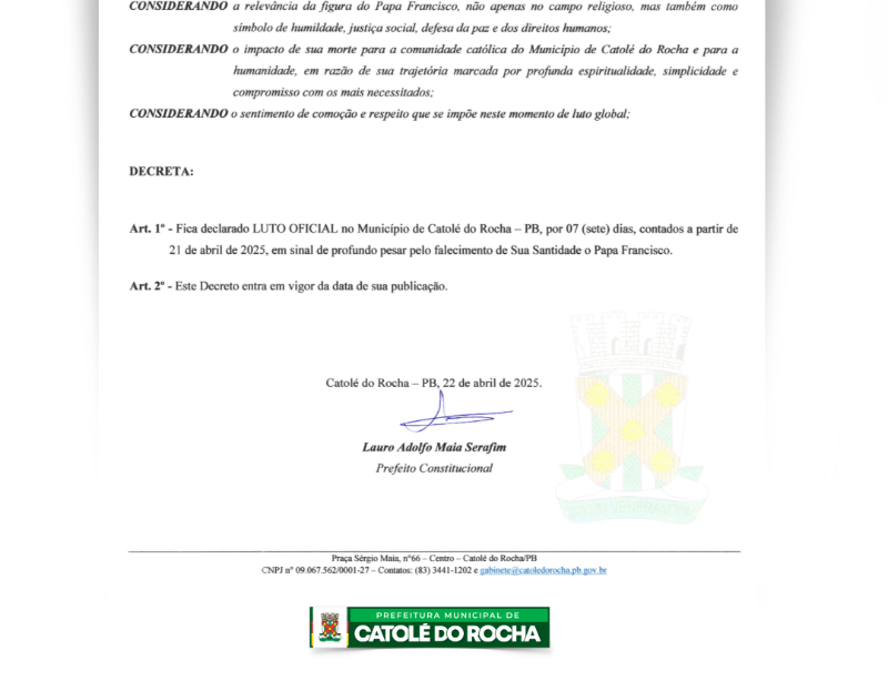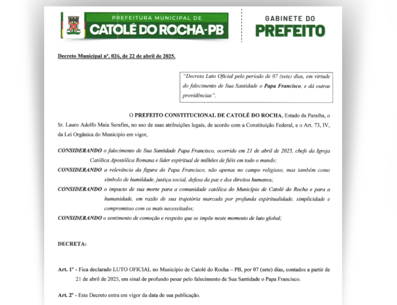 A Prefeitura de Catolé decretou luto oficial de 7 dias na cidade em sinal de profundo pesar pela morte do Papa Francisco ocorrida nesta última segunda-feira (21). O documento de Nº 26 foi assinado nesta terça. Jorge Mario Bergoglio, o Papa Francisco, morreu aos 88 anos, a causa da morte foi um AVC e insuficiência cardíaca, segundo informações do Vaticano.