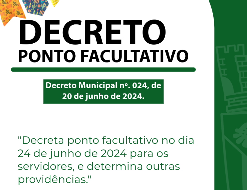 "Decreta ponto facultativo para os servidores públicos municipais no dia 24 de Junho de 2024, e determina outras providências”.