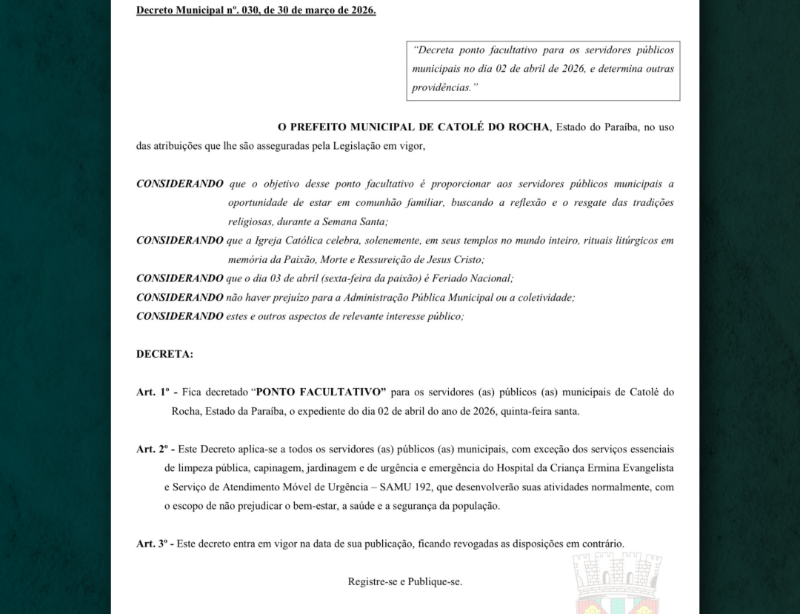 🔖A Prefeitura de Catolé do Rocha informa a publicação do Decreto nº 30/2026, que estabelece ponto facultativo para os servidores públicos municipais no dia 02 de abril (Quinta-feira Santa).A medida é válida para todos os órgãos da administração municipal, com exceção dos serviços essenciais, que funcionarão normalmente, como limpeza pública, capinagem, jardinagem, além dos atendimentos de urgência e emergência do Hospital da Criança Ermina Evangelista e do SAMU 192.