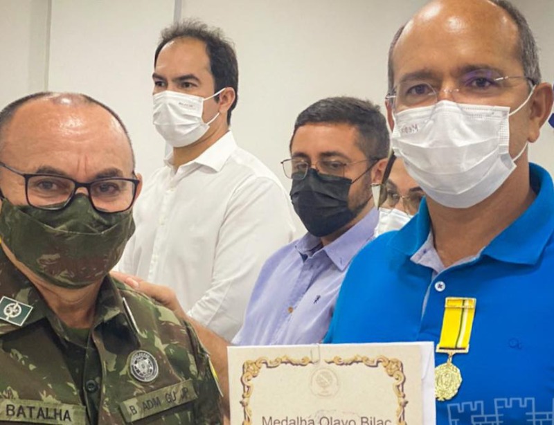 Em solenidade da Academia de Estudos de Assuntos Históricos do Exército Brasileiro (AEAH), o prefeito e presidente da 043ª Junta do Serviço Militar Laurinho Maia e o secretário Alex Bezerra foram empossados para o período 2021/2024 e receberam do chefe do Posto de Recrutamento e Mobilização (PRM) - 1° Ten. José Ronaldo Batalha - a Medalha 'Olavo Bilac'.