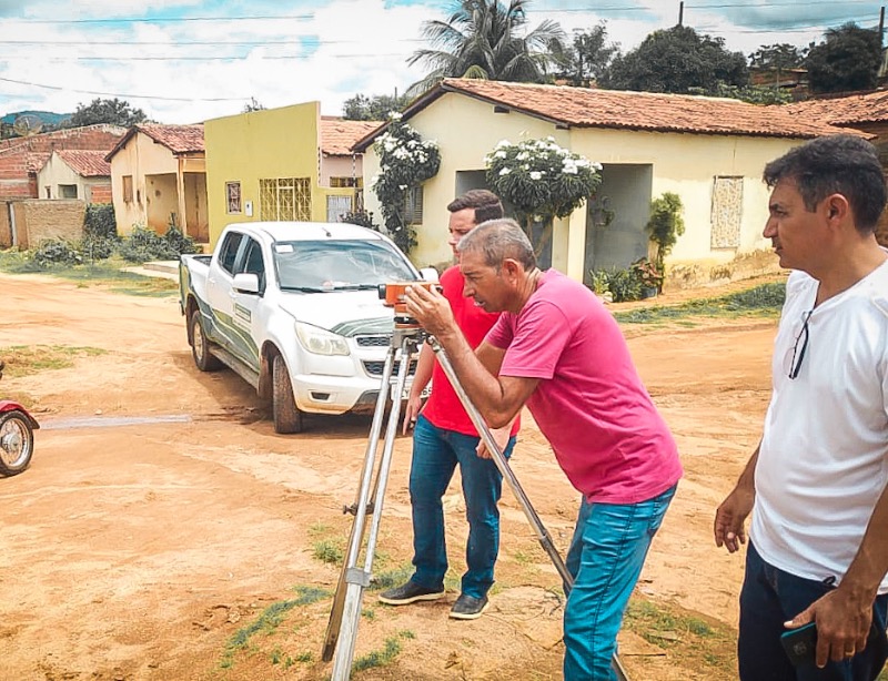 Equipe de engenheiros e técnicos realizando a topografia na rua Dirce Alves, no bairro Tancredo Neves. O local receberá o serviço de pavimentação.O que é topografia? 🤔