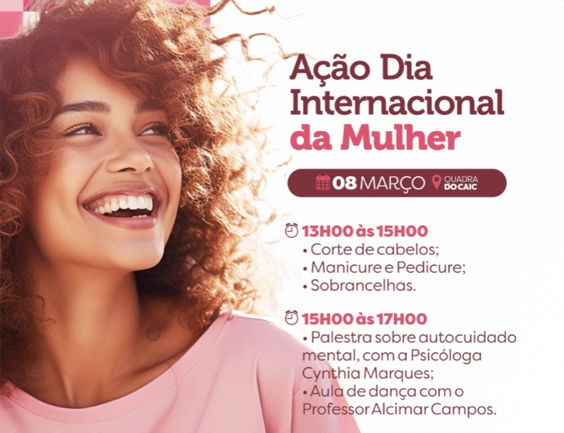 No Dia Internacional da Mulher 🌸 temos uma ação especial para você! Na quadra do CAIC, serão realizadas ações de autocuidado através da Secretaria de Assistência Social em parceria com a Coordenadoria de Políticas Públicas para as Mulheres de Catolé do Rocha.