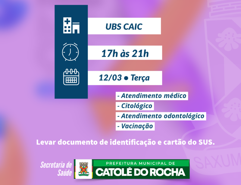 ⚠️ Atendimento Noturno na UBS CAIC nesta terça, dia 12 de Março.Fique atento aos atendimentos e se é necessário agendamento.