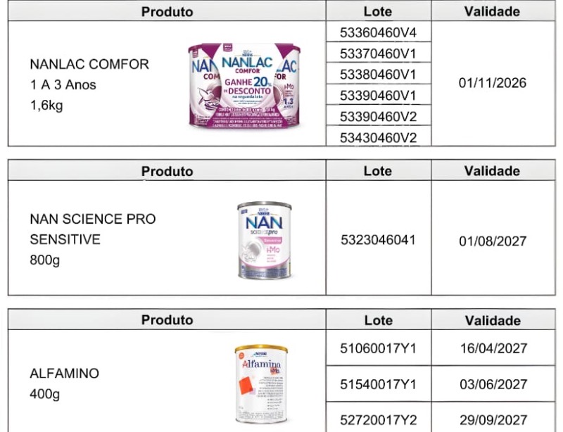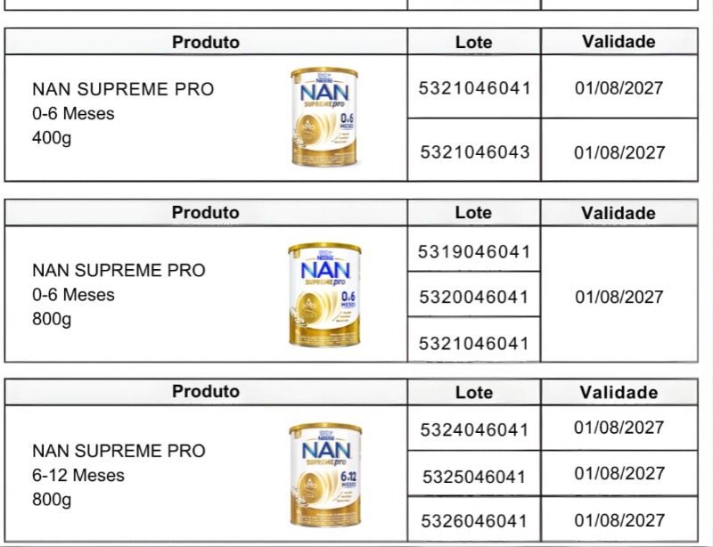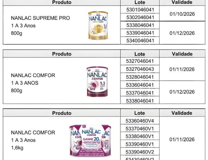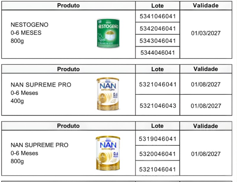 - Se você utiliza produtos das marcas Nestogeno, Nan Supreme, Nanlac Supreme, Nanlac Comfor, Nan Sensitive e Alfamino, verifique o número do lote impresso no rótulo das fórmulas infantis. Se o produto pertencer a um dos lotes recolhidos, não deve ser utilizado ou oferecido para consumo. Os demais lotes desses produtos não foram afetados.